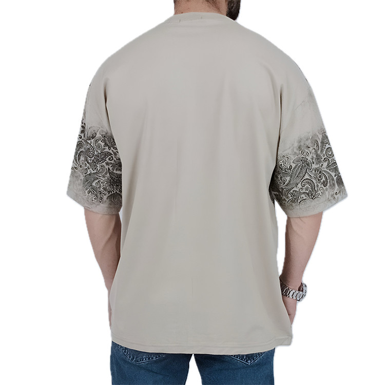 تیشرت آستین کوتاه مردانه باکسی کرم طرح دو رنگ