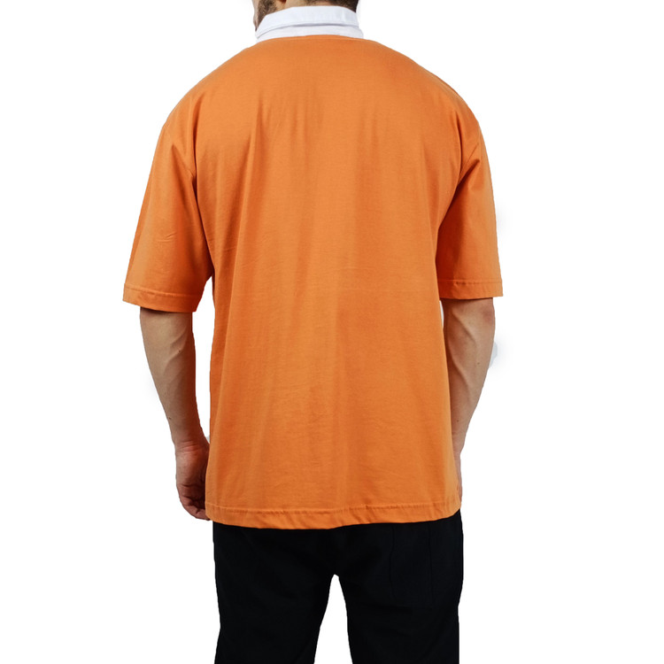 تیشرت آستین کوتاه مردانه هلویی قواره باکسی طرح یقه بلایزر